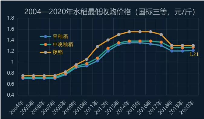 2020年國家繼續(xù)在稻谷主產區(qū)實行最低收購價政策。今年國標三等早秈稻最低收購價為1.21元/斤,較上年上漲一分錢。