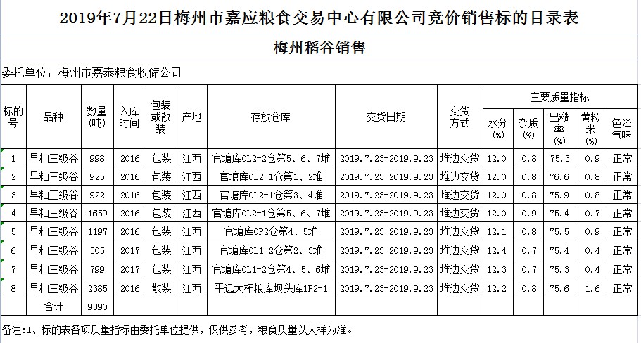 交易時間和地點:2019年7月22日(星期一)上午10時。廣東省梅州市彬芳大道南161號梅州市糧食交易中心3樓。