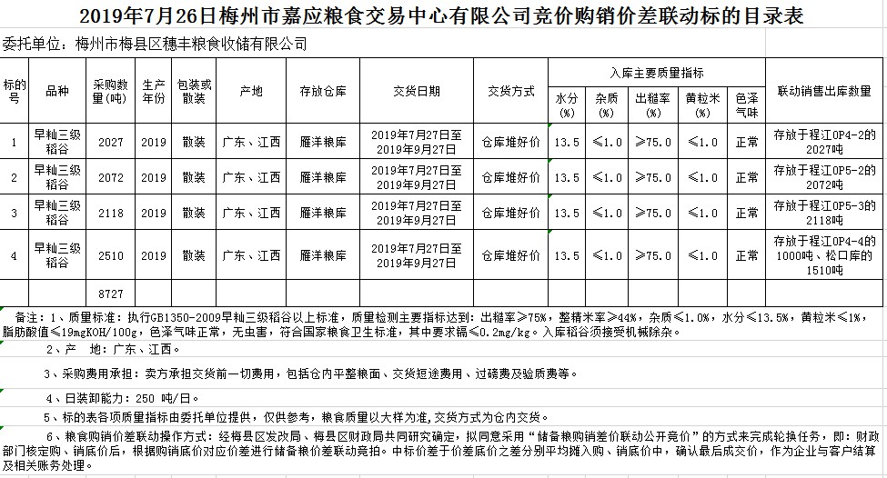 受客戶委托,梅州市嘉應(yīng)糧食交易中心有限公司定于2019年7月26日(星期五)舉辦稻谷購銷價(jià)差聯(lián)動標(biāo)的交易會,梅州市梅縣區(qū)穗豐糧食收儲有限公司擬銷售和采購早秈稻8727噸。