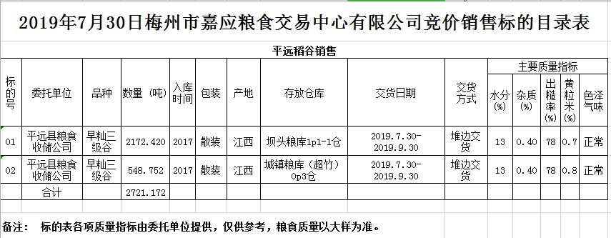 受客戶委托,梅州市嘉應(yīng)糧食交易中心有限公司定于2019年7月30日(星期二)舉辦糧食競價(jià)交易會(huì),平遠(yuǎn)縣糧食收儲(chǔ)公司擬銷售2017年早秈稻2721.172噸。