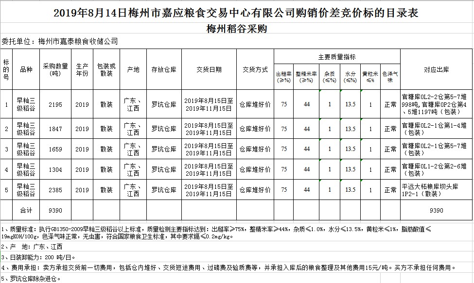 受客戶(hù)委托,梅州市嘉應(yīng)糧食交易中心有限公司定于2019年8月14日(星期三)舉辦稻谷購(gòu)銷(xiāo)價(jià)差聯(lián)動(dòng)標(biāo)的交易會(huì),梅州市嘉泰糧食收儲(chǔ)公司擬銷(xiāo)售和采購(gòu)早秈稻9390噸。