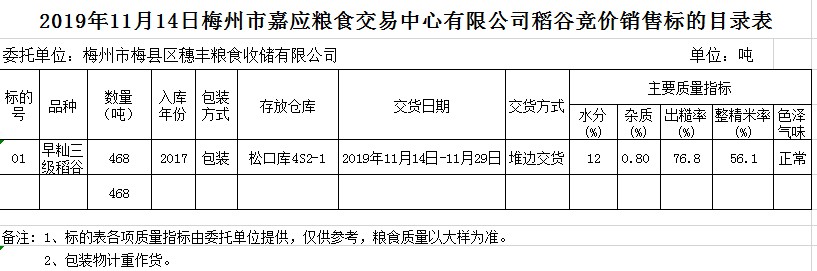 受客戶(hù)委托,梅州市嘉應(yīng)糧食交易中心有限公司定于2019年11月14日(星期四)舉辦糧食競(jìng)價(jià)交易會(huì),梅州市梅縣區(qū)穗豐糧食收儲(chǔ)有限公司擬銷(xiāo)售2017年早秈稻468噸。