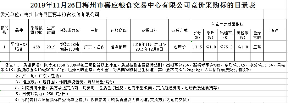 交易時(shí)間和地點(diǎn):2019年11月26日(星期二)上午10時(shí)。廣東省梅州市彬芳大道南161號梅州市糧食交易中心3樓。