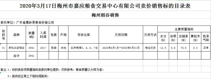 受客戶委托,梅州市嘉應(yīng)糧食交易中心有限公司定于2020年3月17日(星期二)舉辦糧食競價(jià)交易會,廣東省蕉嶺縣糧食收儲公司擬銷售2017年早秈稻2941噸。