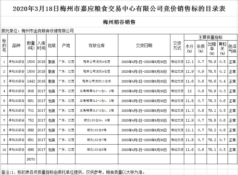 受客戶委托,梅州市嘉應糧食交易中心有限公司定于2020年3月18日(星期三)舉辦糧食競價交易會,梅州市金良糧食收儲有限公司擬銷售2017年、2018年早秈稻9570噸。