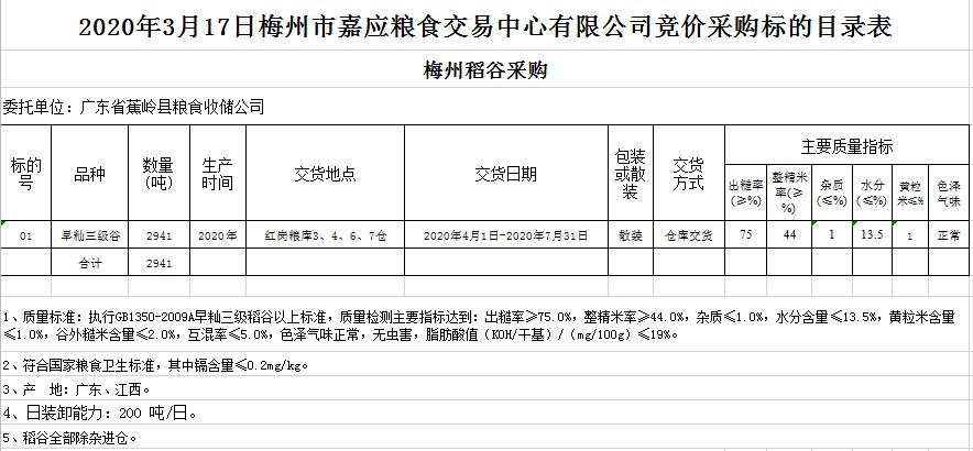 受客戶委托,梅州市嘉應(yīng)糧食交易中心有限公司定于2020年3月17日(星期二)舉辦糧食競(jìng)價(jià)交易會(huì),廣東省蕉嶺縣糧食收儲(chǔ)公司擬采購2020年早秈稻2941噸。