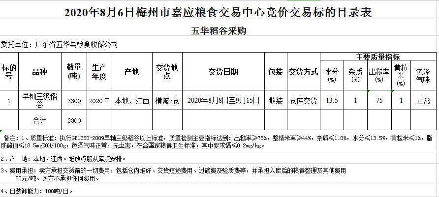受客戶委托,梅州市嘉應(yīng)糧食交易中心有限公司定于2020年8月6日(星期四)舉辦糧食競(jìng)價(jià)交易會(huì),廣東省五華縣糧食收儲(chǔ)公司擬采購2020年早秈稻3300噸。