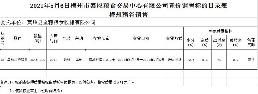 2021年5月6日蕉嶺縣金穗糧食收儲有限公司稻谷銷售