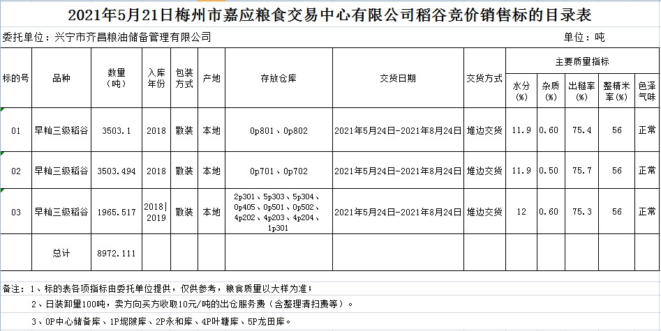 受客戶委托,梅州市嘉應(yīng)糧食交易中心有限公司定于2021521日(星期五)舉辦糧食競(jìng)價(jià)交易會(huì)。興寧市齊昌糧油儲(chǔ)備管理有限公司擬銷售2018、2019年早秈稻8972.111噸。