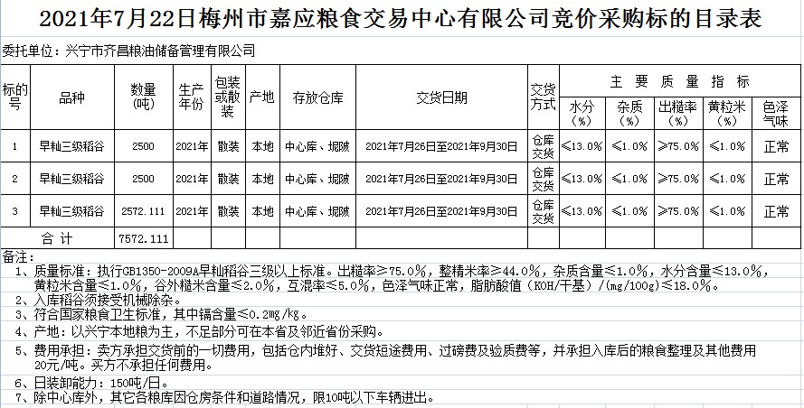 受客戶委托,梅州市嘉應(yīng)糧食交易中心有限公司定于2021年7月22日(星期四)舉辦糧食競(jìng)價(jià)交易會(huì)。興寧市齊昌糧油儲(chǔ)備管理有限公司擬采購(gòu)2021年早秈稻7572.111噸。