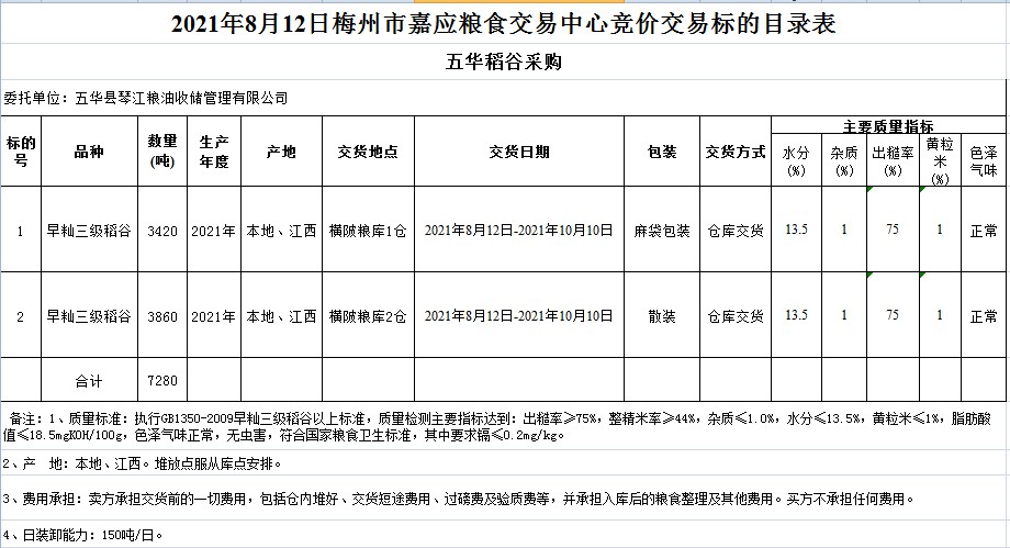 受客戶委托,梅州市嘉應糧食交易中心有限公司定于2021年8月12日(星期四)舉辦糧食競價交易會。五華縣琴江糧油收儲管理有限公司擬采購2021年早秈稻7280噸。