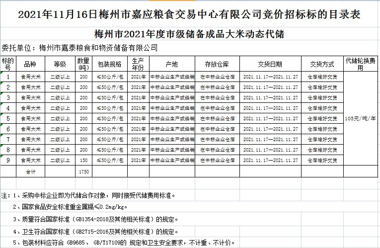 受客戶委托,梅州市嘉應(yīng)糧食交易中心有限公司定于2021年11月16日(星期二)上午10時在廣東省梅州市彬芳大道南161號梅州市糧食交易中心3樓,舉辦梅州市市級儲備成品糧油新一輪動態(tài)代儲采購及包干輪換費公開招標。