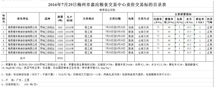 受客戶委托,梅州市嘉應糧食交易中心有限公司定于2016年7月29日舉辦糧食競價交易會,梅州市梅縣區(qū)穗豐糧食收儲有限公司擬采購2016年產(chǎn)早秈三級稻谷6892噸。