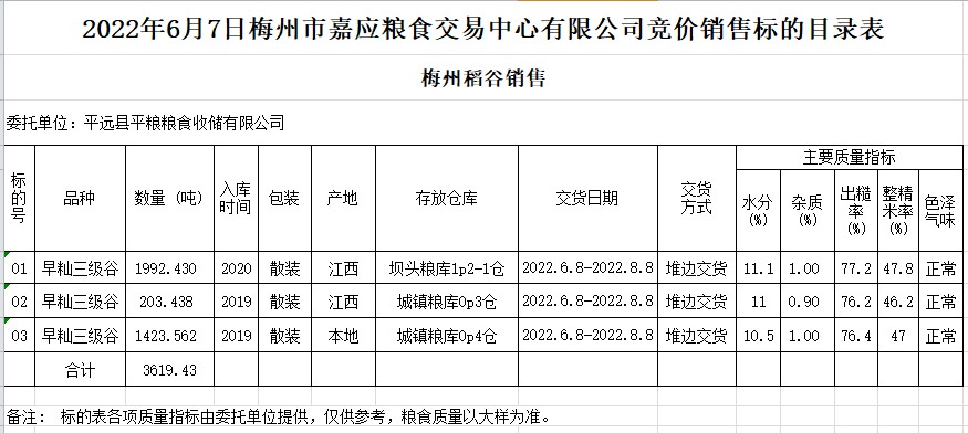 受客戶委托,梅州市嘉應(yīng)糧食交易中心有限公司定于2022年6月7日(星期二)舉辦糧食競(jìng)價(jià)交易會(huì)。平遠(yuǎn)縣平糧糧食收儲(chǔ)有限公司擬銷(xiāo)售2019、2020年早秈稻3619.43噸。