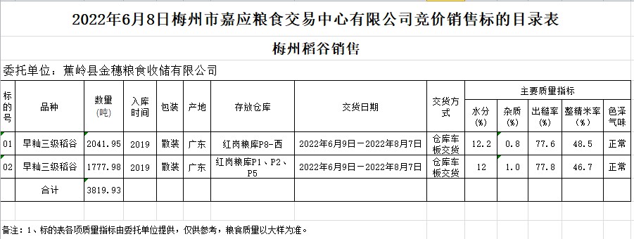 受客戶委托,梅州市嘉應糧食交易中心有限公司定于2022年6月8日(星期三)舉辦糧食競價交易會。蕉嶺縣金穗糧食收儲有限公司擬銷售2019年早秈稻3819.93噸。