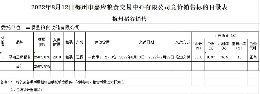 受客戶委托,梅州市嘉應(yīng)糧食交易中心有限公司定于2022年8月12日(星期五)舉辦糧食競(jìng)價(jià)交易會(huì)。豐順縣糧食收儲(chǔ)有限公司擬銷售2019年早秈稻2507.878噸。