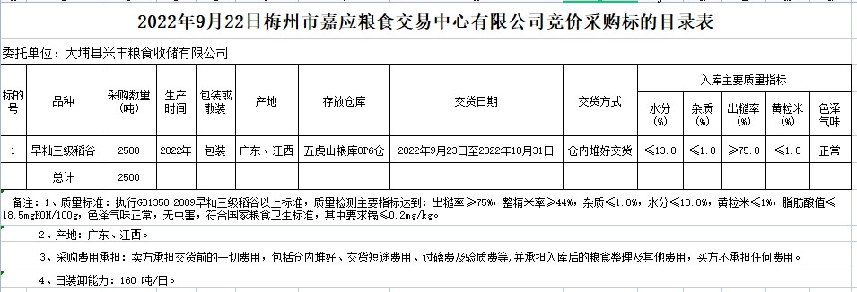 受客戶委托,梅州市嘉應(yīng)糧食交易中心有限公司定于2022年9月22日(星期四)舉辦糧食競價交易會。大埔縣興豐糧食收儲有限公司擬采購2022年早秈稻2500噸。