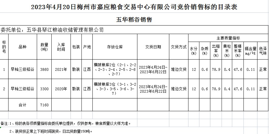 受客戶委托,梅州市嘉應(yīng)糧食交易中心有限公司定于2023年4月20日(星期四)舉辦糧食競價交易會。五華縣琴江糧油收儲管理有限公司擬銷售2020、2021年早秈稻7160噸。