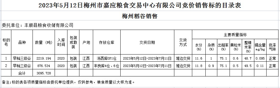 受客戶委托,梅州市嘉應(yīng)糧食交易中心有限公司定于2023年5月12日(星期五)舉辦糧食競(jìng)價(jià)交易會(huì)。豐順縣糧食收儲(chǔ)有限公司擬銷(xiāo)售2020年早秈稻3095.728噸。