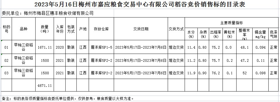 受客戶委托,梅州市嘉應(yīng)糧食交易中心有限公司定于2023年5月16日(星期二)舉辦糧食競價交易會。梅州市梅縣區(qū)穗豐糧食收儲有限公司擬銷售2020、2021年早秈稻4671.11噸。