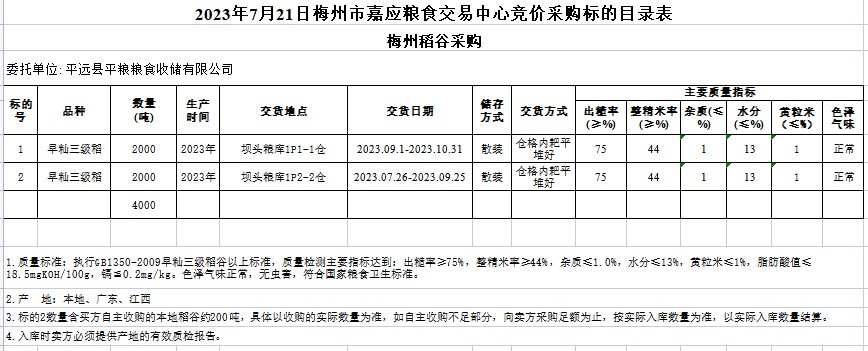 受客戶委托,梅州市嘉應糧食交易中心有限公司定于2023年7月21日(星期五)舉辦糧食競價交易會。平遠縣平糧糧食收儲有限公司擬采購2023年早秈稻4000噸。