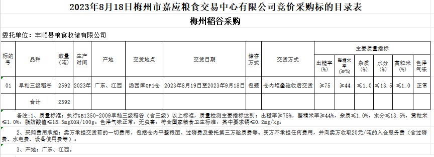 受客戶委托,梅州市嘉應(yīng)糧食交易中心有限公司定于2023年8月18日(星期五)舉辦糧食競(jìng)價(jià)交易會(huì)。豐順縣糧食收儲(chǔ)有限公司擬采購(gòu)2023年早秈稻2592噸。
