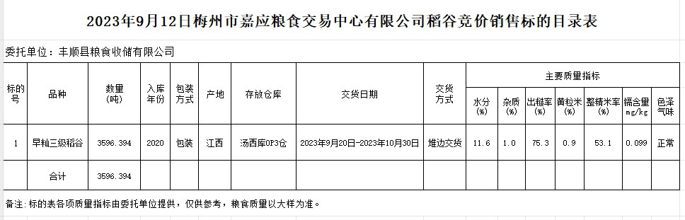 受客戶委托,梅州市嘉應(yīng)糧食交易中心有限公司定于2023年9月12日(星期二)舉辦糧食競(jìng)價(jià)交易會(huì)。豐順縣糧食收儲(chǔ)有限公司擬銷售2020年早秈稻3596.394噸。