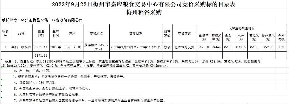 受客戶委托,梅州市嘉應糧食交易中心有限公司定于2023年9月22日(星期五)舉辦糧食競價交易會。梅州市梅縣區(qū)穗豐糧食收儲有限公司擬采購2023年產早秈稻5371.11噸。
