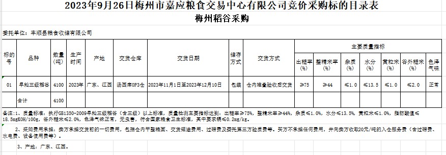 受客戶委托,梅州市嘉應(yīng)糧食交易中心有限公司定于2023年9月26日(星期二)舉辦糧食競價(jià)交易會。豐順縣糧食收儲有限公司擬采購2023年早秈稻谷4100噸。