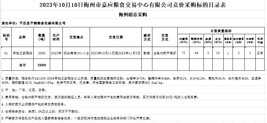 受客戶委托,梅州市嘉應(yīng)糧食交易中心有限公司定于2023年10月10日(星期二)舉辦糧食競價(jià)交易會。平遠(yuǎn)縣平糧糧食收儲有限公司擬采購2023年產(chǎn)早秈稻2000噸。
