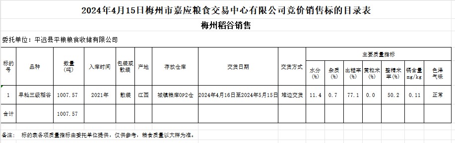 受客戶委托,梅州市嘉應(yīng)糧食交易中心有限公司定于2024年4月15日(星期一)舉辦糧食競價(jià)交易會。平遠(yuǎn)縣平糧糧食收儲有限公司擬銷售2021年產(chǎn)早秈稻1007.57噸。