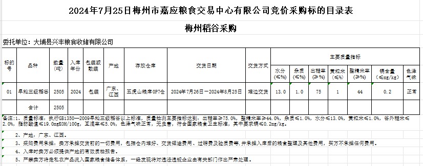 受客戶委托,梅州市嘉應(yīng)糧食交易中心有限公司定于2024年7月25日(星期四)舉辦糧食競(jìng)價(jià)交易會(huì)。大埔縣興豐糧食收儲(chǔ)有限公司擬采購(gòu)2024年產(chǎn)早秈稻谷2505噸。