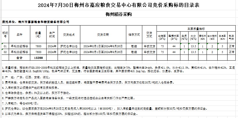受客戶委托,梅州市嘉應糧食交易中心有限公司定于2024年7月30日(星期二)舉辦糧食競價交易會。梅州市嘉泰糧食和物資儲備有限公司擬采購2024年產早秈稻15200噸。