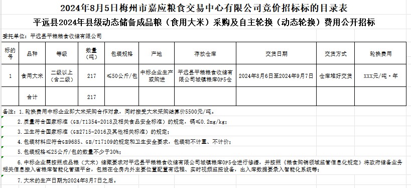 受客戶委托,梅州市嘉應(yīng)糧食交易中心有限公司定于2024年8月5日(星期一)上午10時在廣東省梅州市彬芳大道南161號梅州市糧食交易中心3樓,舉辦平遠(yuǎn)縣2024年縣級動態(tài)儲備成品糧(食用大米)采購及自主輪換(動態(tài)輪換)費(fèi)用公開招標(biāo)。