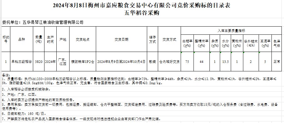 受客戶委托,梅州市嘉應(yīng)糧食交易中心有限公司定于2024年8月8日(星期四)舉辦糧食競(jìng)價(jià)交易會(huì)。五華縣琴江糧油收儲(chǔ)管理有限公司擬采購(gòu)2024年產(chǎn)早秈稻谷3820噸。