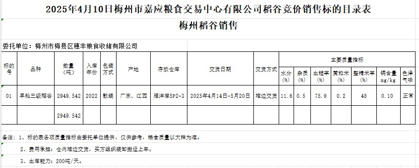 受客戶委托,梅州市嘉應(yīng)糧食交易中心有限公司定于2025年4月10日(星期四)舉辦糧食競(jìng)價(jià)交易會(huì)。梅州市梅縣區(qū)穗豐糧食收儲(chǔ)有限公司擬銷售2022年產(chǎn)早秈稻谷2949.542噸。