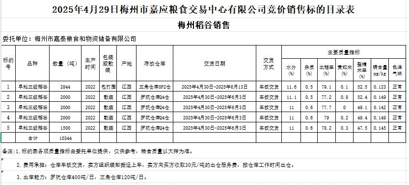 受客戶委托,梅州市嘉應糧食交易中心有限公司定于2025年4月29日(星期二)舉辦糧食競價交易會。梅州市嘉泰糧食和物資儲備有限公司擬銷售2022年產(chǎn)早秈稻谷10344噸。