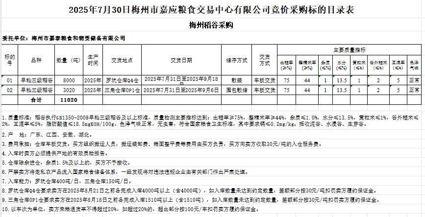 受客戶委托,梅州市嘉應糧食交易中心有限公司定于2025年7月30日(星期三)舉辦糧食競價交易會。梅州市嘉泰糧食和物資儲備有限公司擬采購2025年產早秈稻谷11020噸。