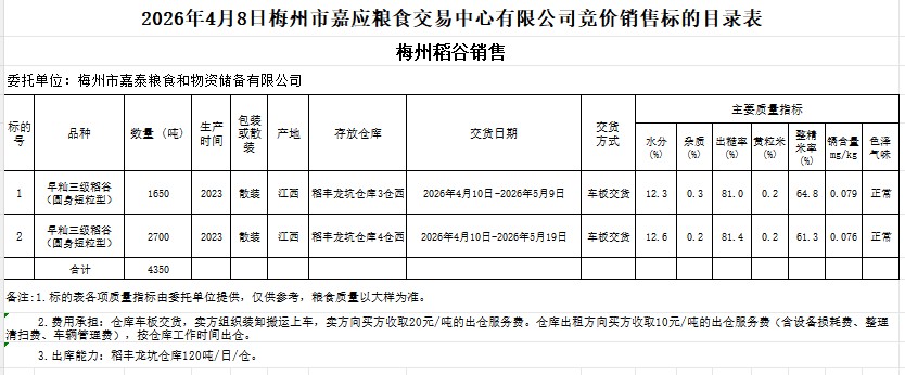 2026年4月8日梅州市嘉泰糧食和物資儲(chǔ)備有限公司稻谷銷售