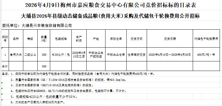 大埔縣2026年縣級動態(tài)儲備成品糧(食用大米)采購及代儲包干輪換費(fèi)用公開招標(biāo)公告