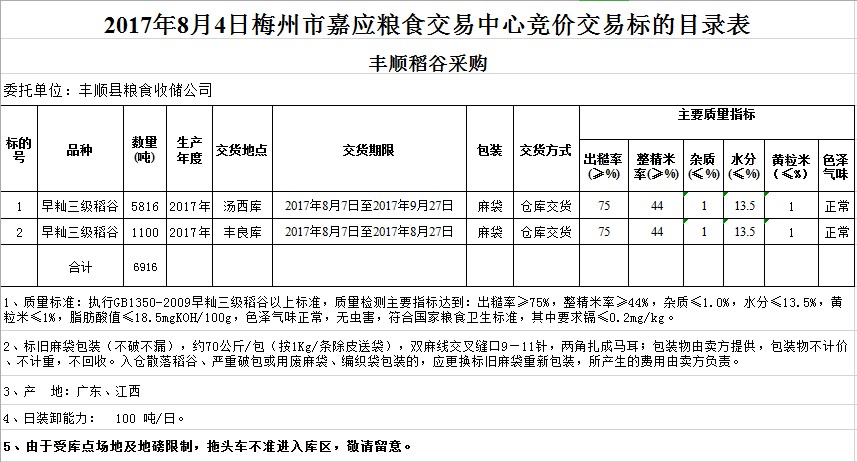 受客戶委托,梅州市嘉應(yīng)糧食交易中心有限公司定于2017年8月4日舉辦糧食競(jìng)價(jià)交易會(huì),豐順縣糧食收儲(chǔ)公司擬采購(gòu)2017年早秈三級(jí)稻谷共6916噸。