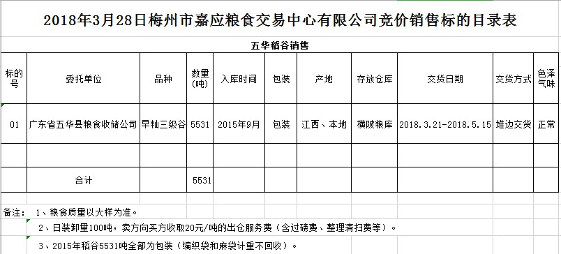 受客戶委托,梅州市嘉應(yīng)糧食交易中心有限公司定于2018年3月28日(星期三)舉辦糧食競(jìng)價(jià)交易會(huì),廣東省五華縣糧食收儲(chǔ)公司擬銷售早秈稻5531噸。