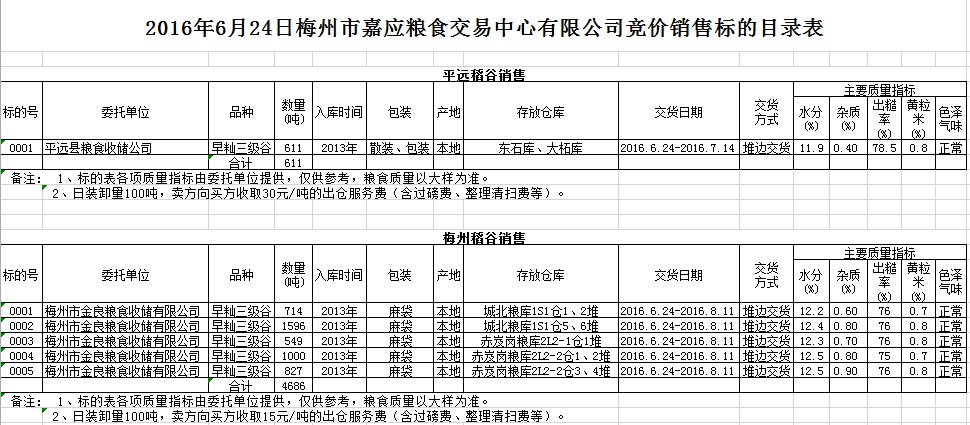受客戶委托,梅州市嘉應糧食交易中心有限公司定于2016624日舉辦糧食競價交易會,平遠縣糧食收儲公司擬銷售2013年早秈稻谷611噸,梅州市金良糧食收儲有限公司擬銷售2013年早秈稻谷4686。